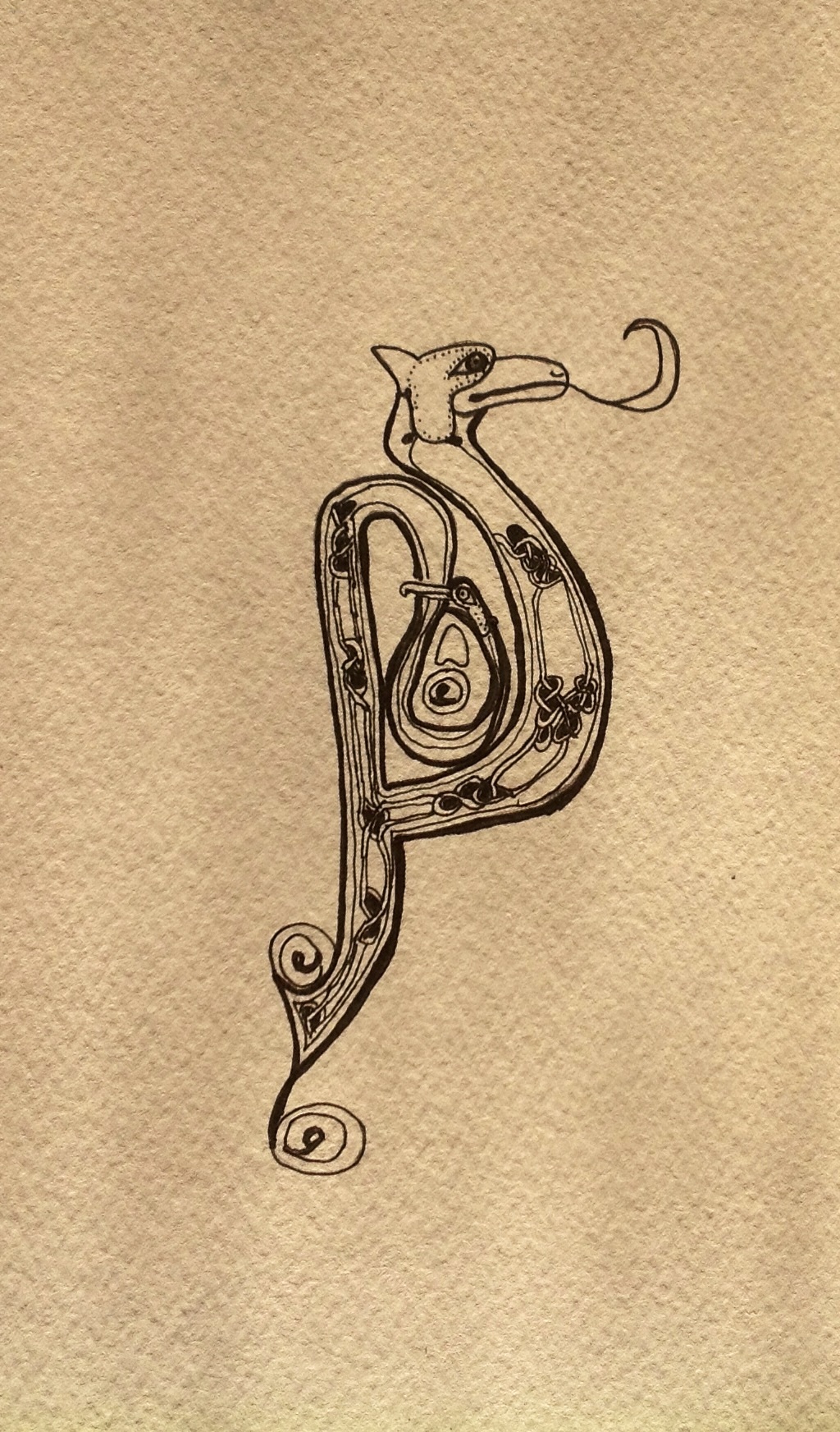 I have been looking at the Lindisfarne Gospels over the last few weeks in the British Library, before it goes to its brilliant summer exhibition in Durham. On the page that is open, within its glass case, is a letter ‘P’ shaped like a dragon.